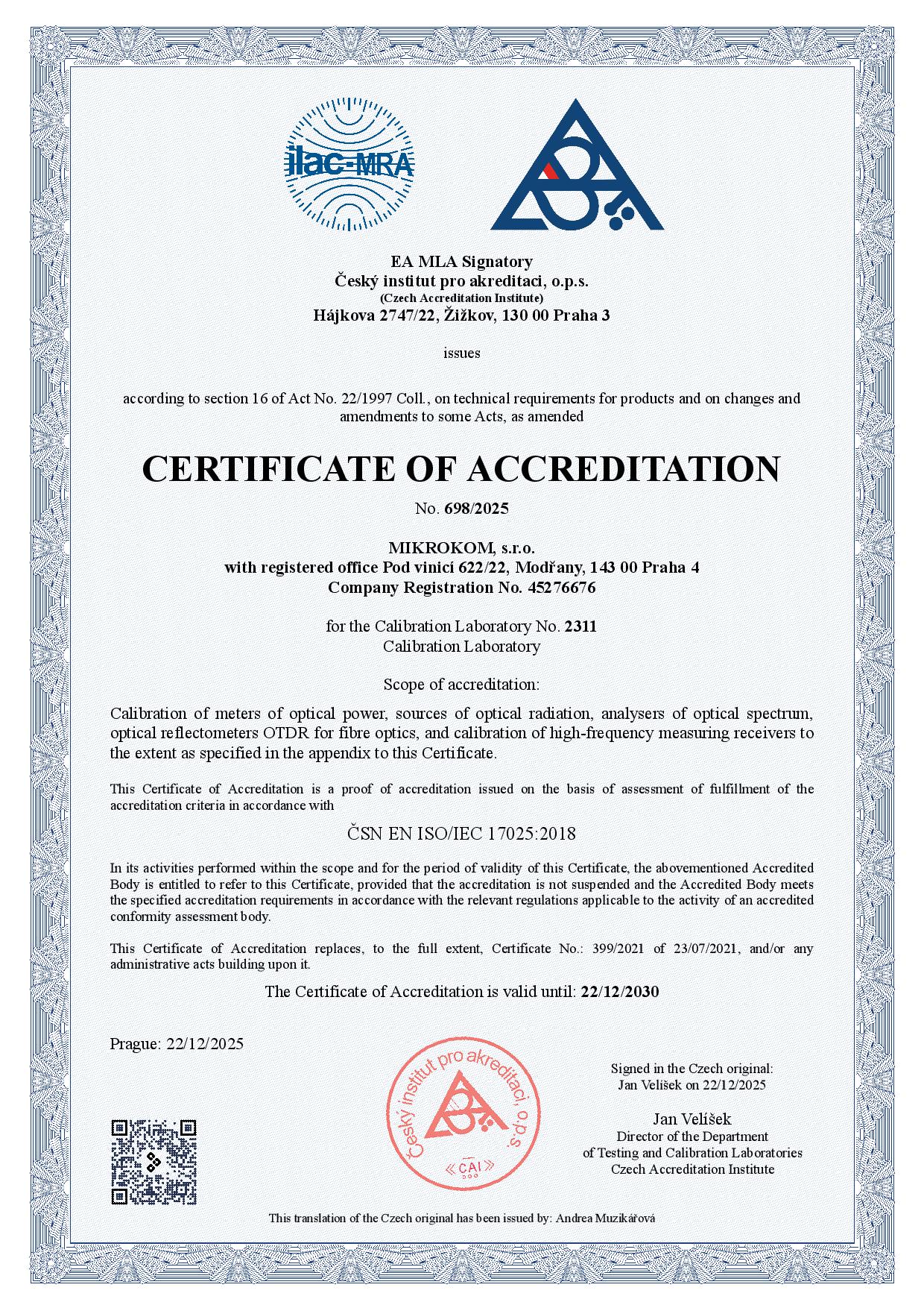 CERTIFICATE OF ACCREDITATION according to EN ISO/IEC 17025