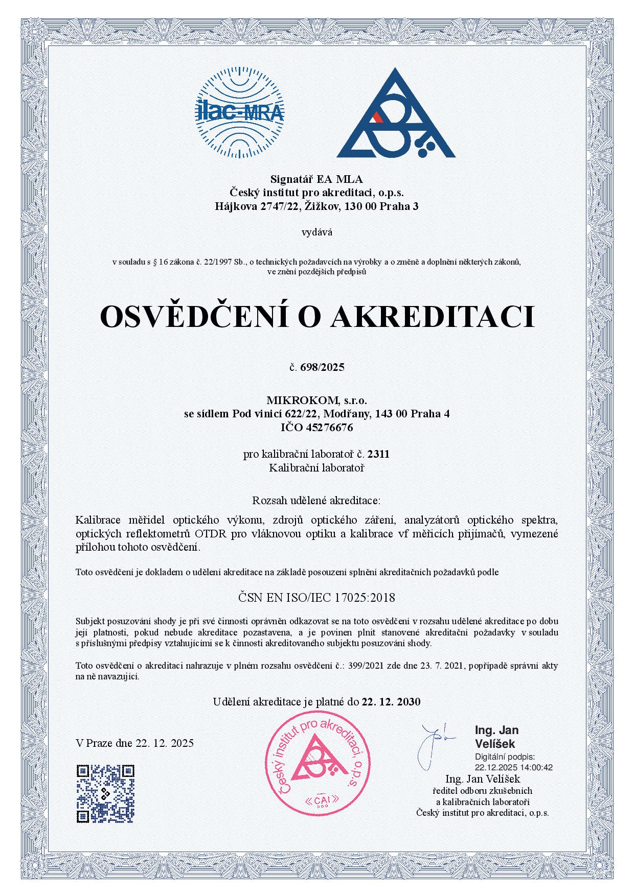 Osvědčení o akreditaci dle ČSN EN ISO/IEC 17025 CZ